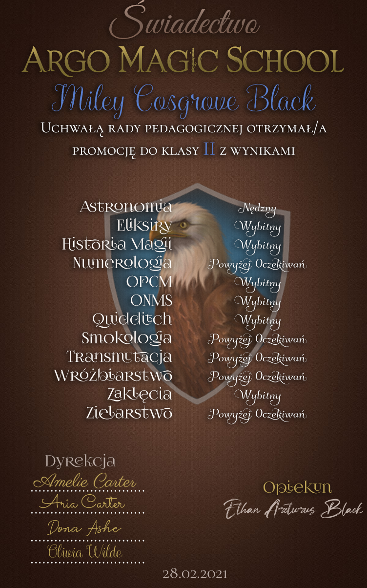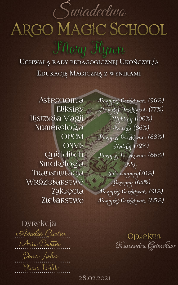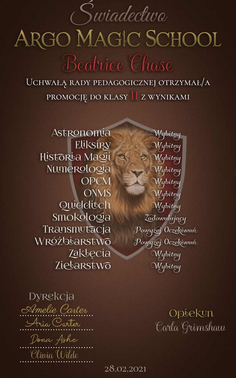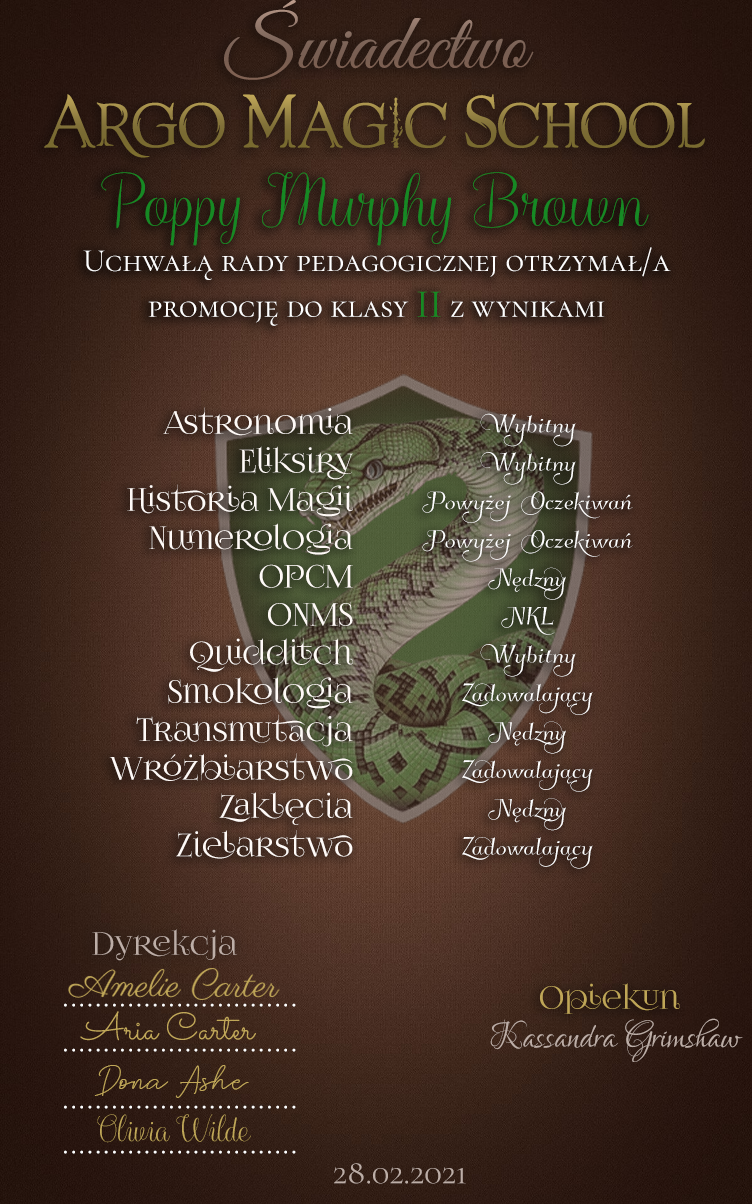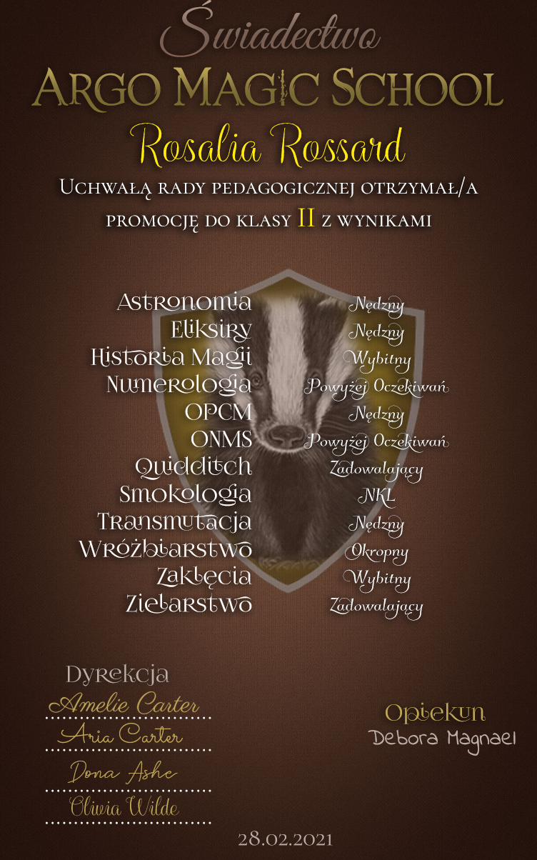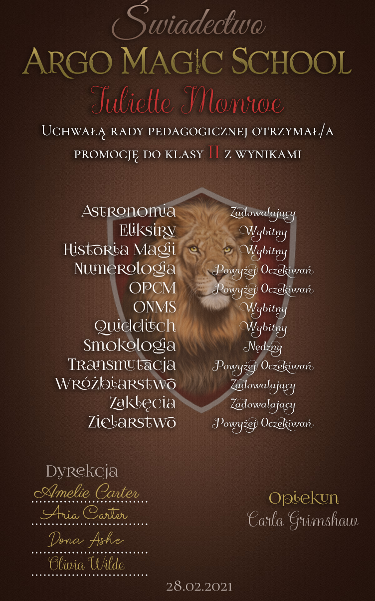 Na koniec chciałabym jeszcze pogratulować wam uzyskanych wyników i podziękować za ten rok. Mam nadzieję, że nie byłam aż taka zła. No cóż, drugoklasistom życzę powodzenia w dalszej karierze magicznej a z pierwszą klasą mam nadzieję zobaczyć się w przyszłym semestrze.