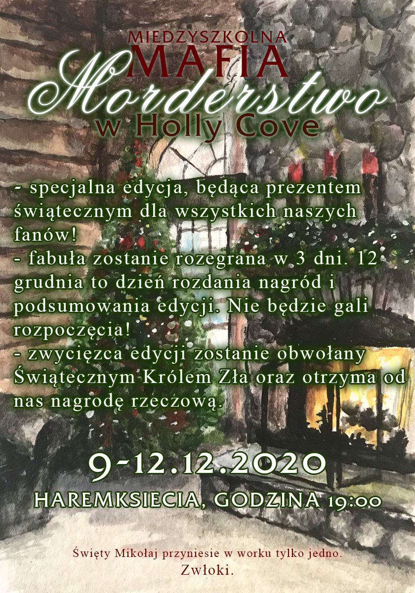 W imieniu wszystkich organizatorów mam ogromną przyjemność zaprosić Was na specjalną edycję Międzyszkolnej Mafii! Jej podtytuł to Morderstwo w Holly Cove - nie jest to oficjalna 10. edycja wydarzenia! Wracamy ponownie, aby umilić Wam czas oczekiwania na Boże Narodzenie. Nie zabraknie rozwiązywania zagadek, umysłowych potyczek i zbierania poszlak w celu odnalezienia mordercę. Edycja ta odbędzie się w dniach 9-12 grudnia 2020 roku. Jak zwykle, zapraszamy Was codziennie o godzinie 20:00 do pokoju HaremKsiecia. Aby móc zagrać z nami, należy zapisać się w tym linku. Aby poznać nietypowe zasady tej edycji, polecam kliknięcie w łącze, które przekieruje Was na stronę poradnika.