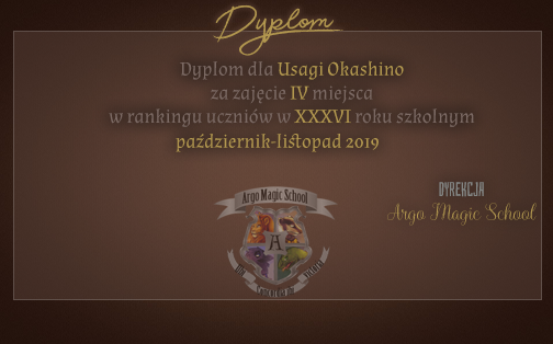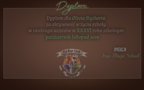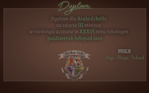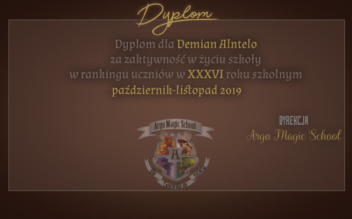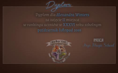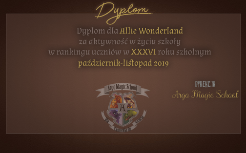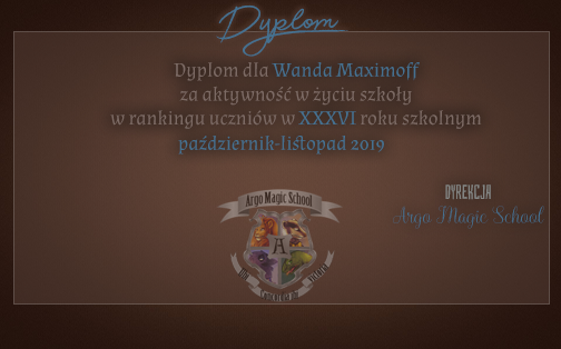 Z powodu pewnych komplikacji, Argo Magic School 27 listopada 2019 roku zawiesza swoją działalność w Świecie Magii. Jest Nam przykro, że nie dotrwaliśmy do końca roku, dlatego poniżej znajdują się gratyfikacje za aktywność w XXXVI roku szkolnym.
